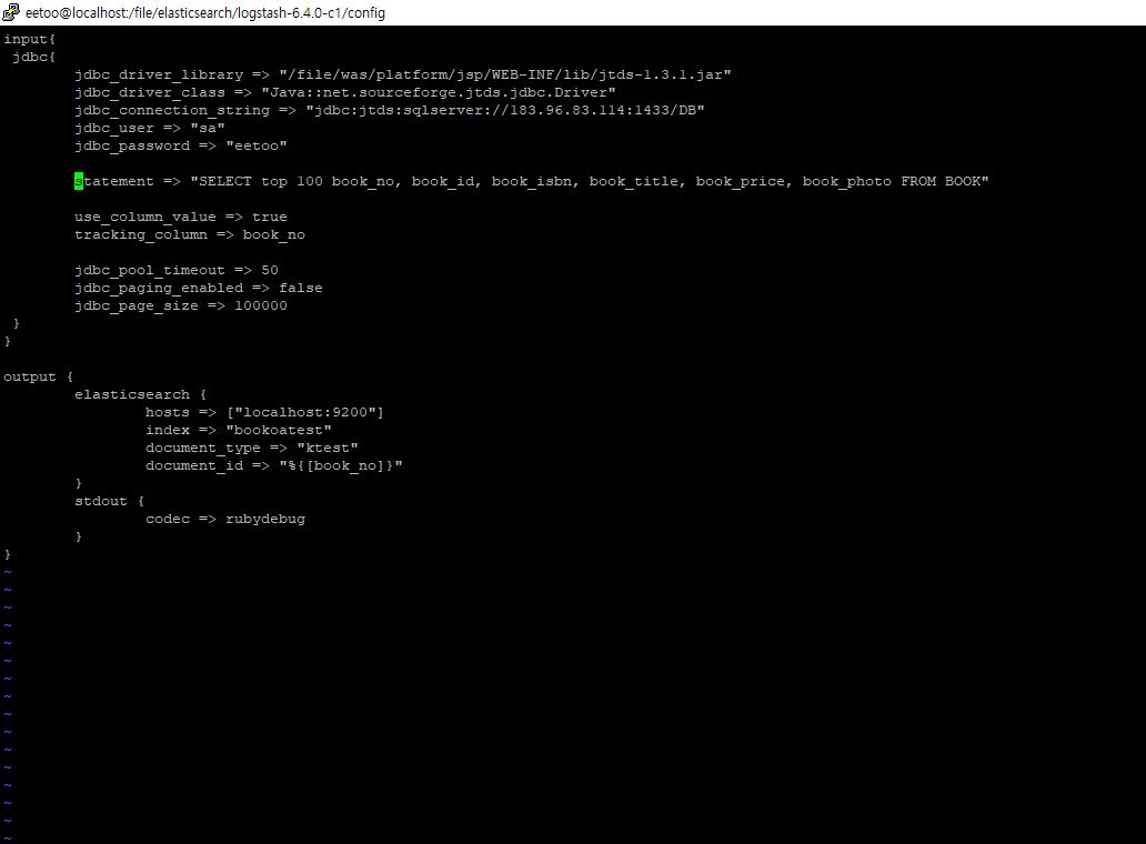 이렇게 하면 logstash.conf 에서 JDBC 플러그인을 통해 직접 RDBMS의 데이터에 sql 쿼리를 보내서 데이터를 받아 JSON형태로 ES에 넣어줄 수 있다. 다음은 예시이다.