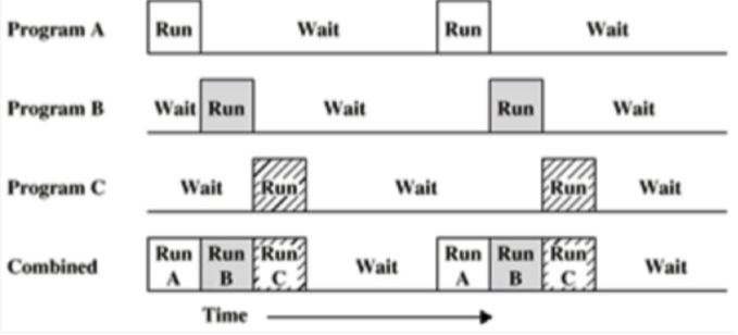 각각 실행시간이 동일한 3개의 프로그램(프로세스)가 있고 Wait를 저장매체로부터 읽기에 소모되는 시간으로 가정하면